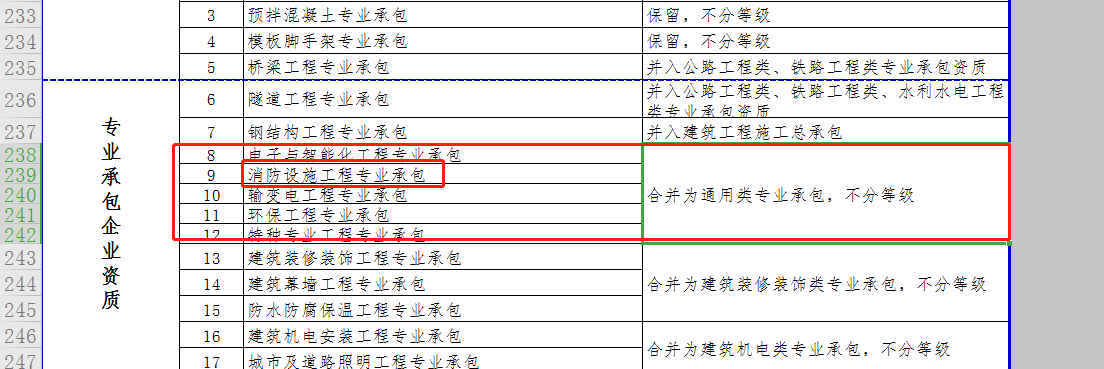 其中:消防設(shè)施施工專業(yè)承包資質(zhì)和其他幾項資質(zhì)合并為通用類專業(yè)承包,不分等級。